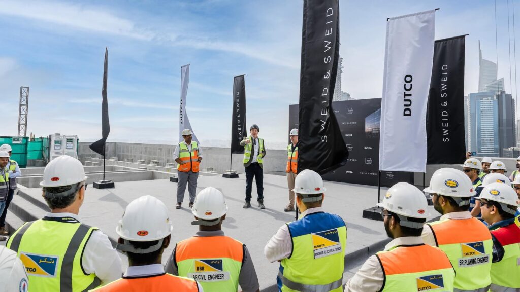 Sweid & Sweid has achieved a key construction milestone at Sweid One with the casting of the roof slab, marking the completion of structural concrete works at the Grade A office development. The topping out ceremony, a time-honoured construction tradition that signals the completion of the building’s core structure, was attended by project stakeholders from Sweid & Sweid and main contractor, Dutco.